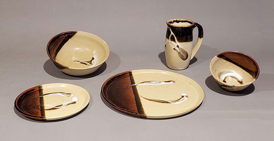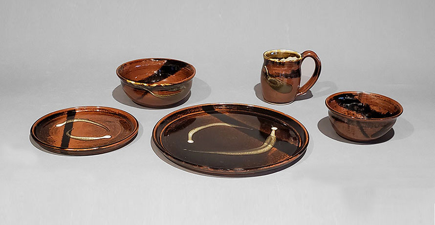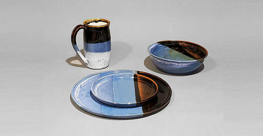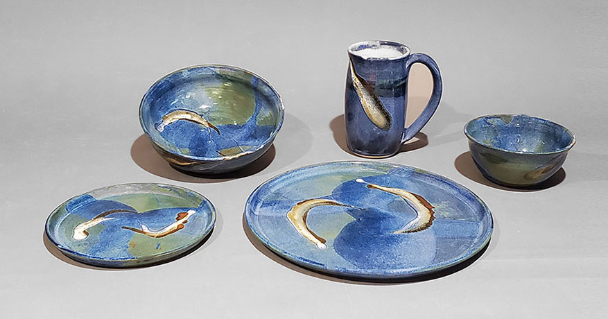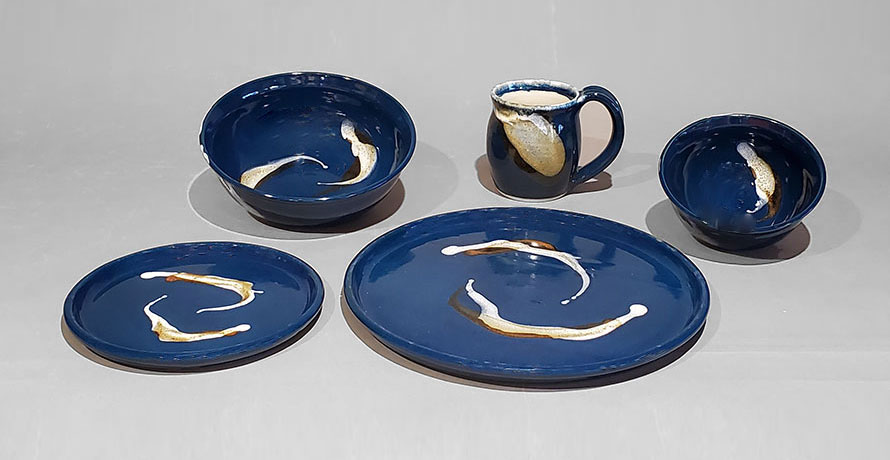 various combinations of plates, bowls and mugs based on the foods that you eat/serve. The glazes are food safe and the pottery