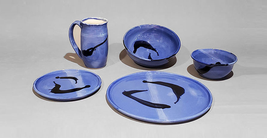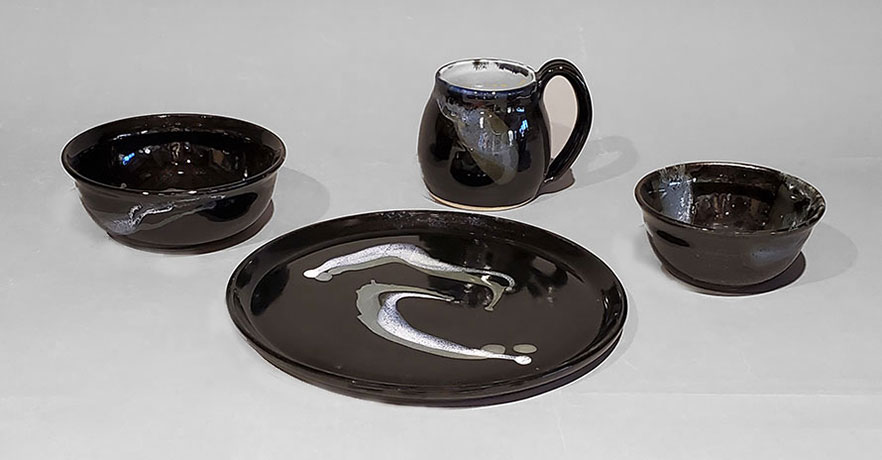 various combinations of plates, bowls and mugs based on the foods that you eat/serve. The glazes are food safe and the pottery